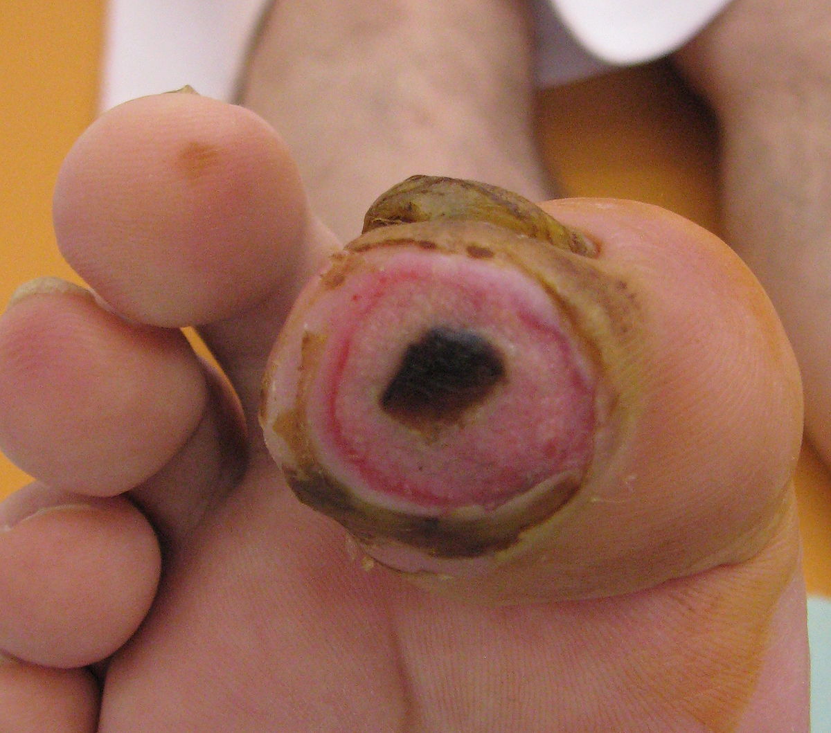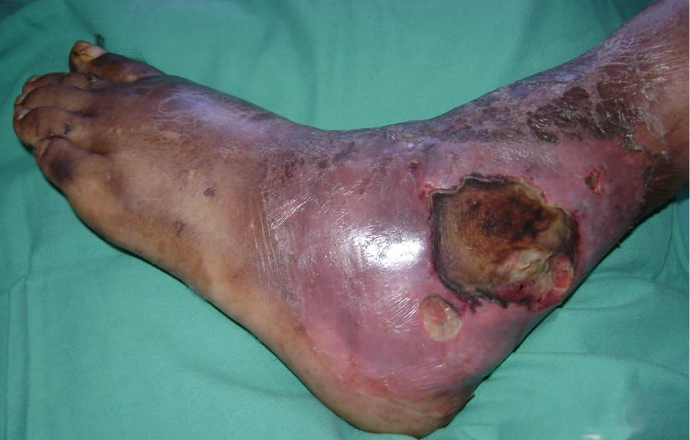 - Nekroza i gangrena (odumiranja pojedinih delova stopala), kojoj često prethodi flegmona. Destrukcija izazvana (nekrozom) ćelijapraćena flegmonom glavni je uzrok ograničenog ili masivnog izumiranja tkiva stopala i brojnih parcijalnih ili totalnih amputacija u neuropatskom i neuroishemičnom stopalu.